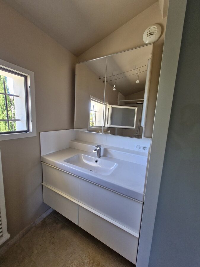 Entièrement climatisée et équipée pour un confort optimal, la villa comprend trois chambres spacieuses, dont une suite parentale avec salle d’eau privative et dressing, une salle de bain indépendante, deux WC séparés et une buanderie.