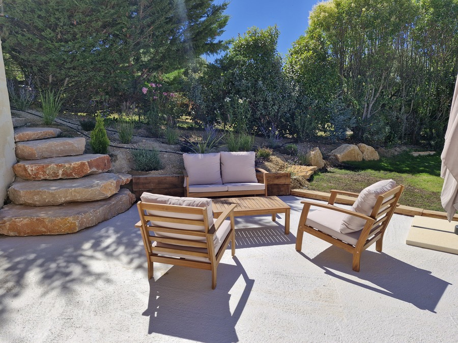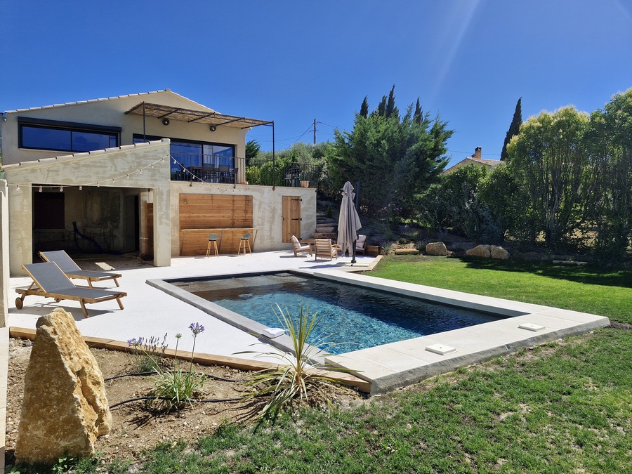 À l’extérieur, le terrain en restanque mène au jardin où se déploie la piscine, entourée de verdure et baignée de lumière.